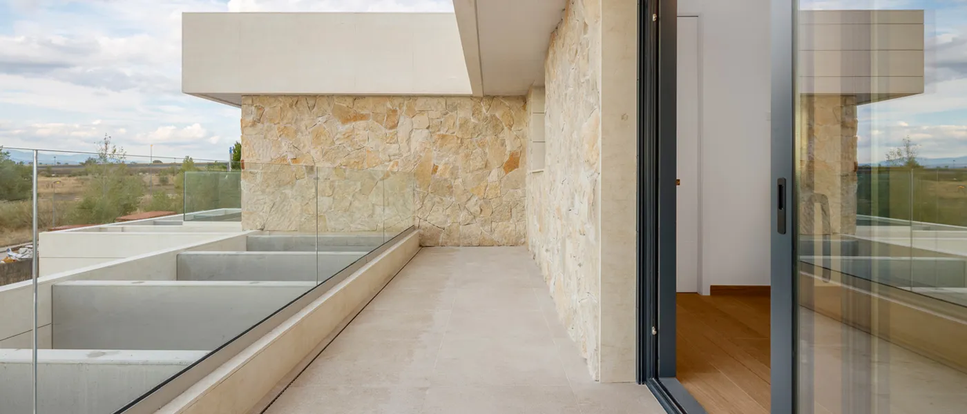 Lo más destacado de esta vivienda industrializada construida en urbanización Los Satélites de Majadahonda es lo diferente que son los materiales en fachada. Originalmente La fachada se proyectó mediante fachada ventilada y piedra natural y así lo hicimos. Técnicamente es posible porque el hormigón es una material dónde se pudieron apoyar rastreles y atornillar directamente para instalar el porcelánico de remate. Así mismo y en el mismo paño se colocó piedra cuarcita natural in situ tal y como la Dirección Facultativa ordenó.